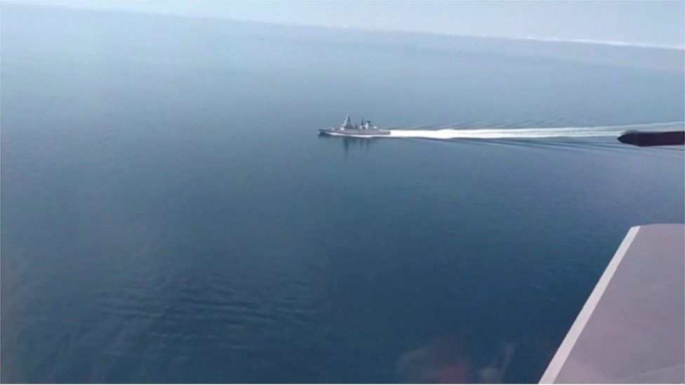 Moscow's defence ministry said a patrol ship fired warning shots and a jet dropped bombs in the Royal Naval ship's path.